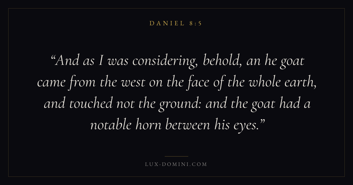 And as I was considering, behold, an he goat came from the west on the face of the whole earth, and touched not the ground: and the goat had a notable horn between his eyes.