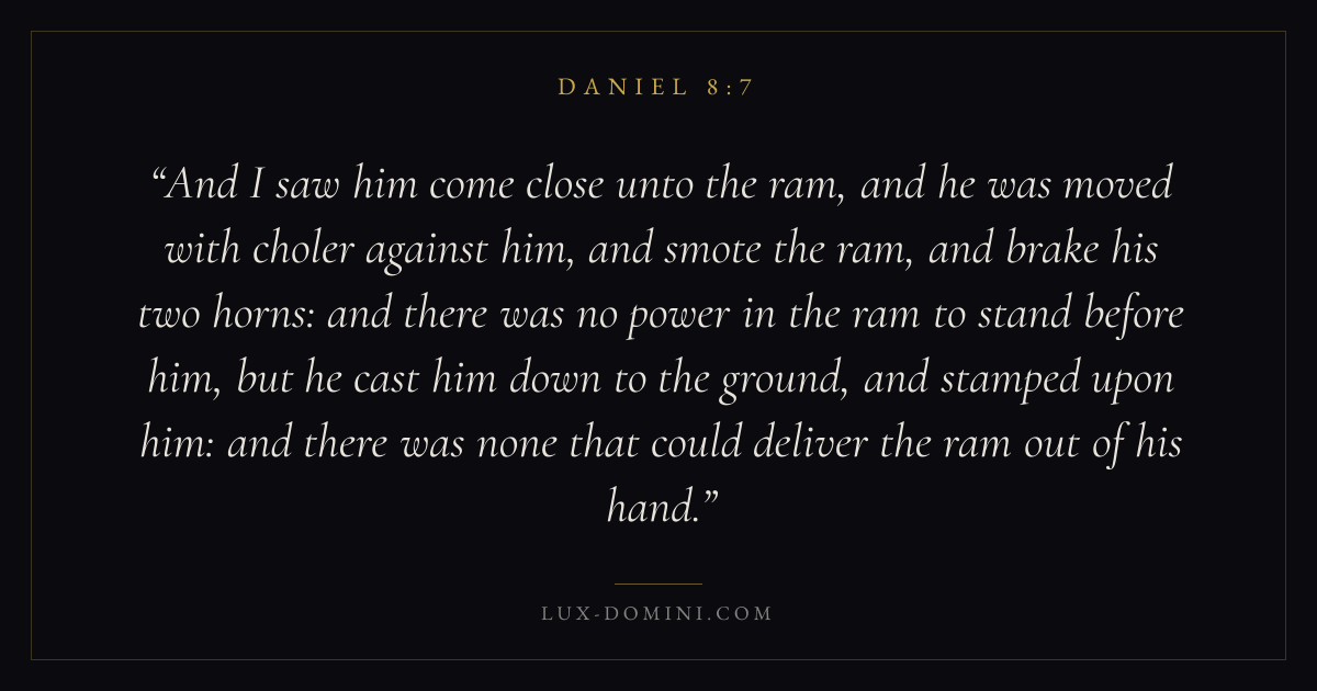 And I saw him come close unto the ram, and he was moved with choler against him, and smote the ram, and brake his two horns: and there was no power in the ram to stand before him, but he cast him down to the ground, and stamped upon him: and there was none that could deliver the ram out of his hand.