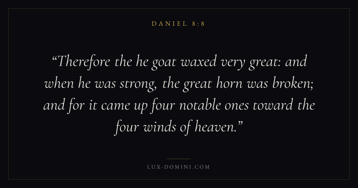 Therefore the he goat waxed very great: and when he was strong, the great horn was broken; and for it came up four notable ones toward the four winds of heaven.