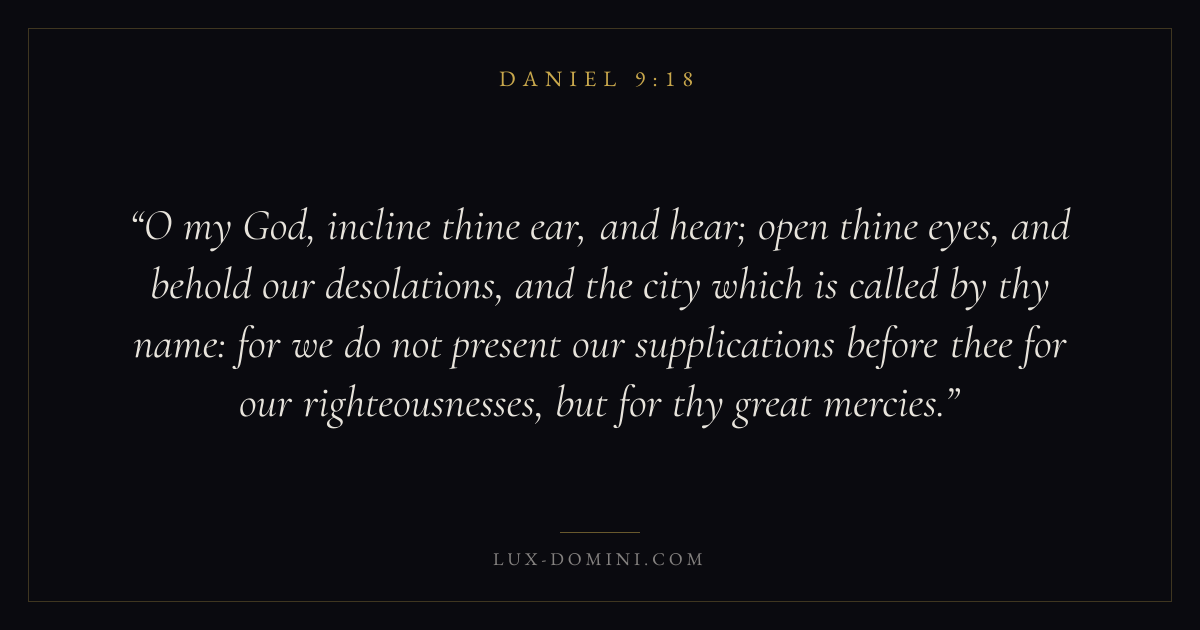 O my God, incline thine ear, and hear; open thine eyes, and behold our desolations, and the city which is called by thy name: for we do not present our supplications before thee for our righteousnesses, but for thy great mercies.