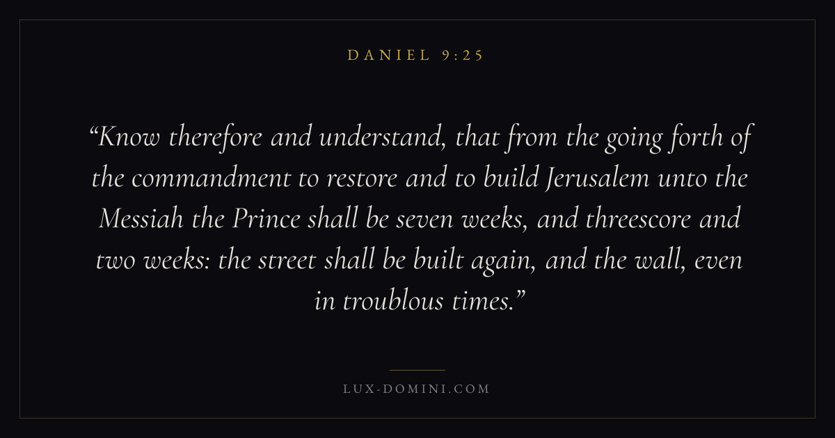 Know therefore and understand, that from the going forth of the commandment to restore and to build Jerusalem unto the Messiah the Prince shall be seven weeks, and threescore and two weeks: the street shall be built again, and the wall, even in troublous times.
