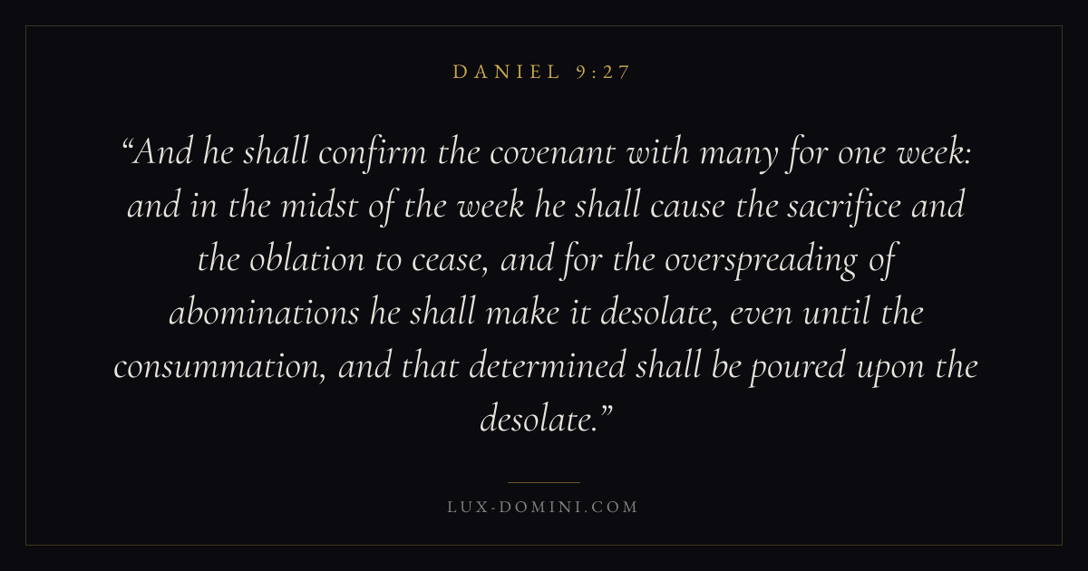 And he shall confirm the covenant with many for one week: and in the midst of the week he shall cause the sacrifice and the oblation to cease, and for the overspreading of abominations he shall make it desolate, even until the consummation, and that determined shall be poured upon the desolate.