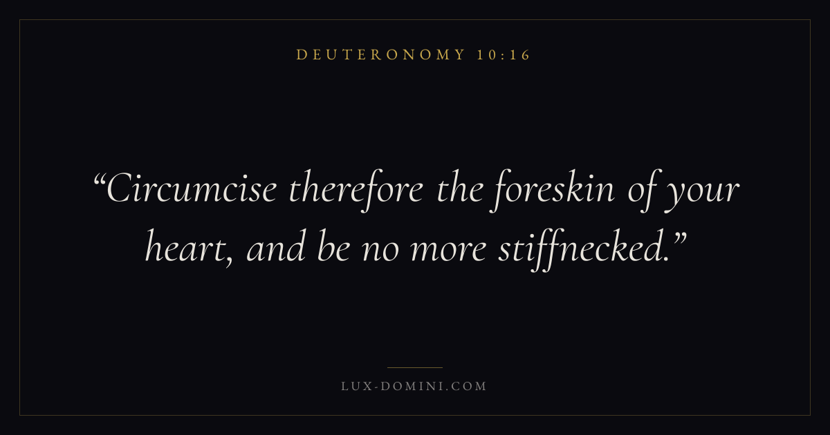 Books / Deuteronomy / Chapter 10 / Verse 16 ← Deuteronomy 10:15 Deuteronomy 10:16 Deuteronomy 10:17 → Circumcise therefore the foreskin of your heart, and be no more stiffnecked. Download verse card Share on Twitter Share on Facebook Pin it ✦ Key themes LoveAnxiety and fearMemoryCovenant Read with Deuteronomy 10:17Deuteronomy 10:18John 3:161 Corinthians 13:4 Related topics Bible verses about loveBible verses about anxiety and fear ✦ Deuteronomy Chapter 10 verses V. 1 V. 2 V. 3 V. 4 V. 5 V. 6 V. 7 V. 8 V. 9 V. 10 V. 11 V. 12 V. 13 V. 14 V. 15 V. 16 V. 17 V. 18 V. 19 V. 20 V. 21 V. 22