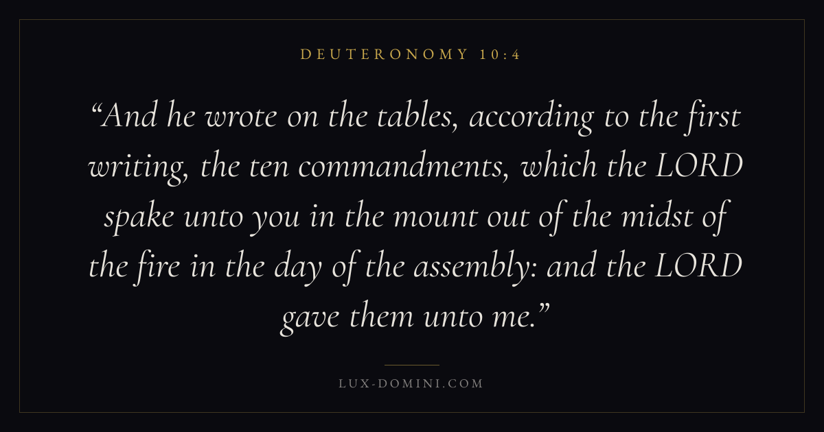And he wrote on the tables, according to the first writing, the ten commandments, which the LORD spake unto you in the mount out of the midst of the fire in the day of the assembly: and the LORD gave them unto me.