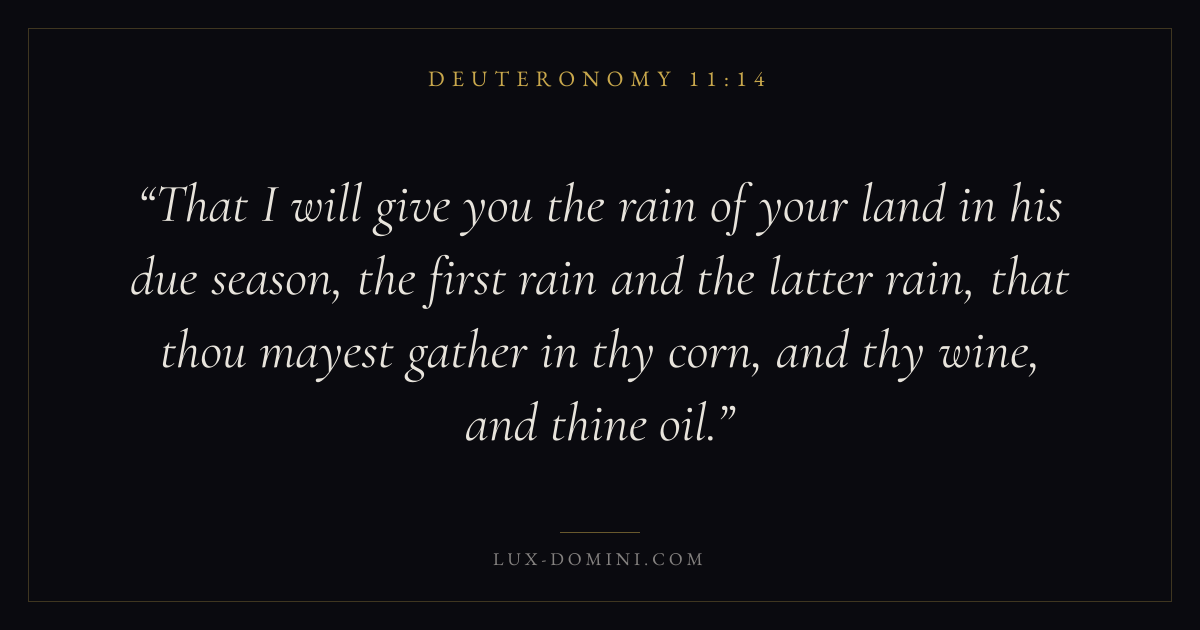 That I will give you the rain of your land in his due season, the first rain and the latter rain, that thou mayest gather in thy corn, and thy wine, and thine oil.