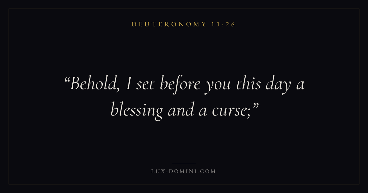 Books / Deuteronomy / Chapter 11 / Verse 26 ← Deuteronomy 11:25 Deuteronomy 11:26 Deuteronomy 11:27 → Behold, I set before you this day a blessing and a curse; Download verse card Share on Twitter Share on Facebook Pin it ✦ Key themes LoveMemoryCovenantLove of God Read with Deuteronomy 11:27Deuteronomy 11:28John 3:161 Corinthians 13:4 Related topics Bible verses about love ✦ Deuteronomy Chapter 11 verses V. 1 V. 2 V. 3 V. 4 V. 5 V. 6 V. 7 V. 8 V. 9 V. 10 V. 11 V. 12 V. 13 V. 14 V. 15 V. 16 V. 17 V. 18 V. 19 V. 20 V. 21 V. 22 V. 23 V. 24 V. 25 V. 26 V. 27 V. 28 V. 29 V. 30 V. 31 V. 32