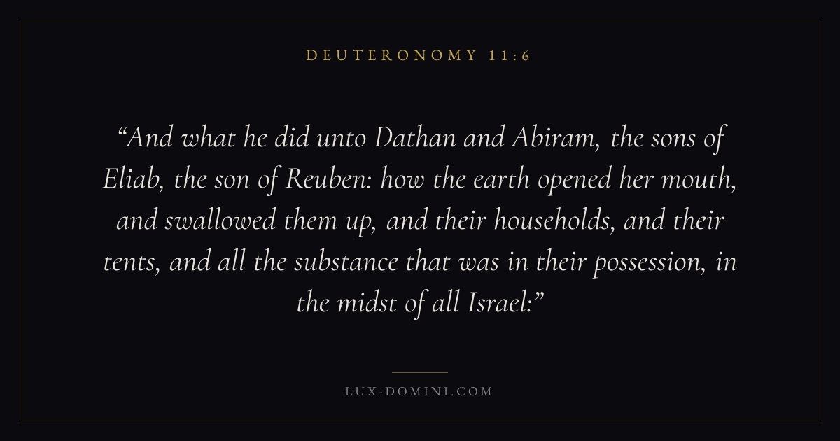 And what he did unto Dathan and Abiram, the sons of Eliab, the son of Reuben: how the earth opened her mouth, and swallowed them up, and their households, and their tents, and all the substance that was in their possession, in the midst of all Israel: