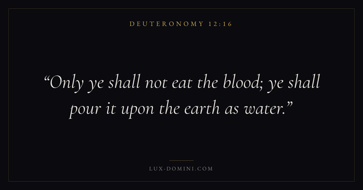 Books / Deuteronomy / Chapter 12 / Verse 16 ← Deuteronomy 12:15 Deuteronomy 12:16 Deuteronomy 12:17 → Only ye shall not eat the blood; ye shall pour it upon the earth as water. Download verse card Share on Twitter Share on Facebook Pin it ✦ Key themes LoveHopePrayerMemory Read with Deuteronomy 12:15John 3:161 Corinthians 13:4Romans 8:24 Related topics Bible verses about loveBible verses about hopeBible verses about prayer ✦ Deuteronomy Chapter 12 verses V. 1 V. 2 V. 3 V. 4 V. 5 V. 6 V. 7 V. 8 V. 9 V. 10 V. 11 V. 12 V. 13 V. 14 V. 15 V. 16 V. 17 V. 18 V. 19 V. 20 V. 21 V. 22 V. 23 V. 24 V. 25 V. 26 V. 27 V. 28 V. 29 V. 30 V. 31 V. 32