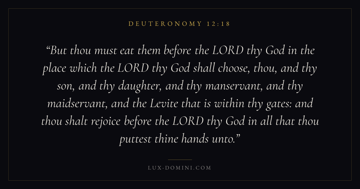 But thou must eat them before the LORD thy God in the place which the LORD thy God shall choose, thou, and thy son, and thy daughter, and thy manservant, and thy maidservant, and the Levite that is within thy gates: and thou shalt rejoice before the LORD thy God in all that thou puttest thine hands unto.