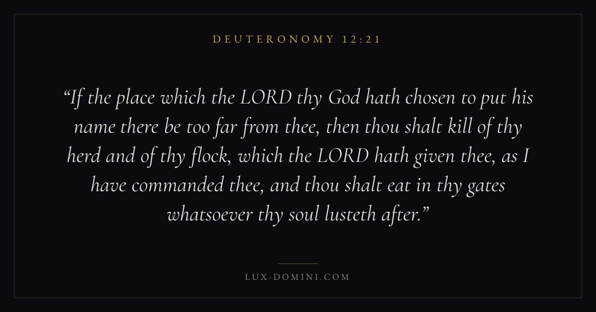 If the place which the LORD thy God hath chosen to put his name there be too far from thee, then thou shalt kill of thy herd and of thy flock, which the LORD hath given thee, as I have commanded thee, and thou shalt eat in thy gates whatsoever thy soul lusteth after.