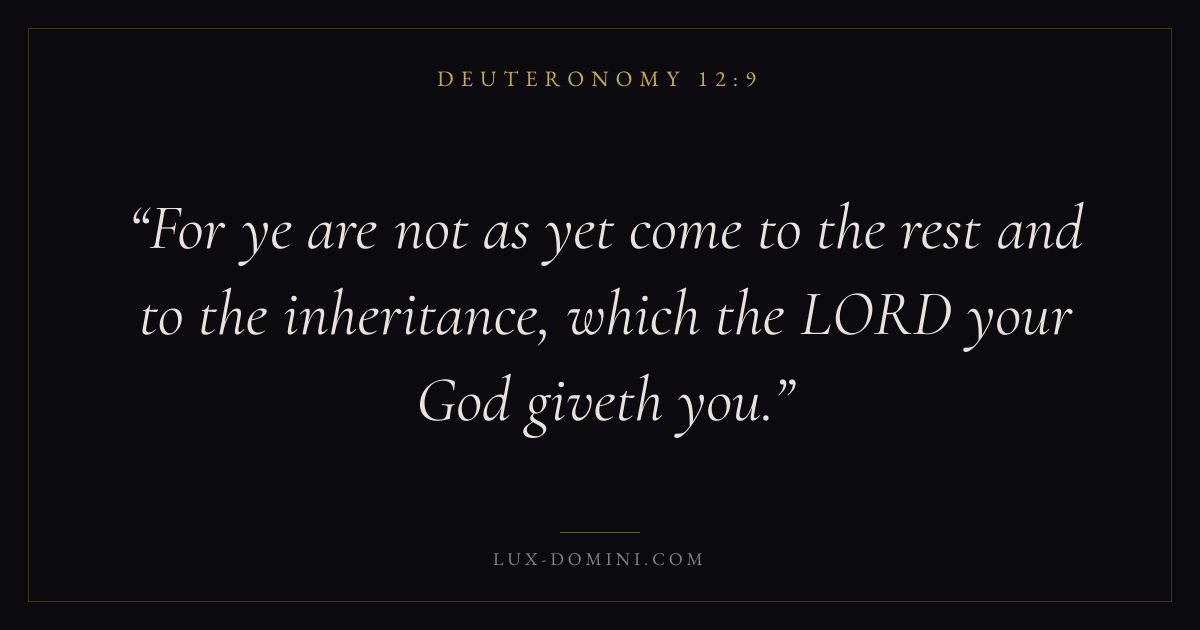 Books / Deuteronomy / Chapter 12 / Verse 9 ← Deuteronomy 12:8 Deuteronomy 12:9 Deuteronomy 12:10 → For ye are not as yet come to the rest and to the inheritance, which the LORD your God giveth you. Download verse card Share on Twitter Share on Facebook Pin it ✦ Key themes LoveHopePrayerPeaceMemory Read with Deuteronomy 12:8Deuteronomy 12:10John 3:161 Corinthians 13:4 Related topics Bible verses about loveBible verses about hopeBible verses about prayerBible verses about peace ✦ Deuteronomy Chapter 12 verses V. 1 V. 2 V. 3 V. 4 V. 5 V. 6 V. 7 V. 8 V. 9 V. 10 V. 11 V. 12 V. 13 V. 14 V. 15 V. 16 V. 17 V. 18 V. 19 V. 20 V. 21 V. 22 V. 23 V. 24 V. 25 V. 26 V. 27 V. 28 V. 29 V. 30 V. 31 V. 32