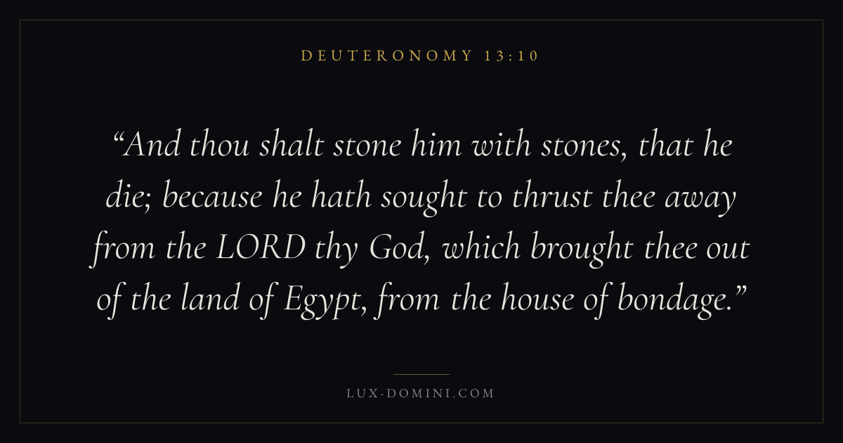 And thou shalt stone him with stones, that he die; because he hath sought to thrust thee away from the LORD thy God, which brought thee out of the land of Egypt, from the house of bondage.