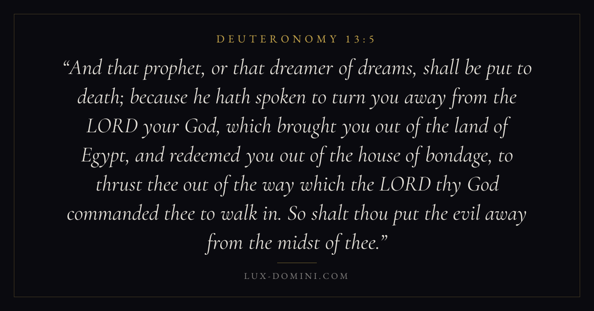 And that prophet, or that dreamer of dreams, shall be put to death; because he hath spoken to turn you away from the LORD your God, which brought you out of the land of Egypt, and redeemed you out of the house of bondage, to thrust thee out of the way which the LORD thy God commanded thee to walk in. So shalt thou put the evil away from the midst of thee.