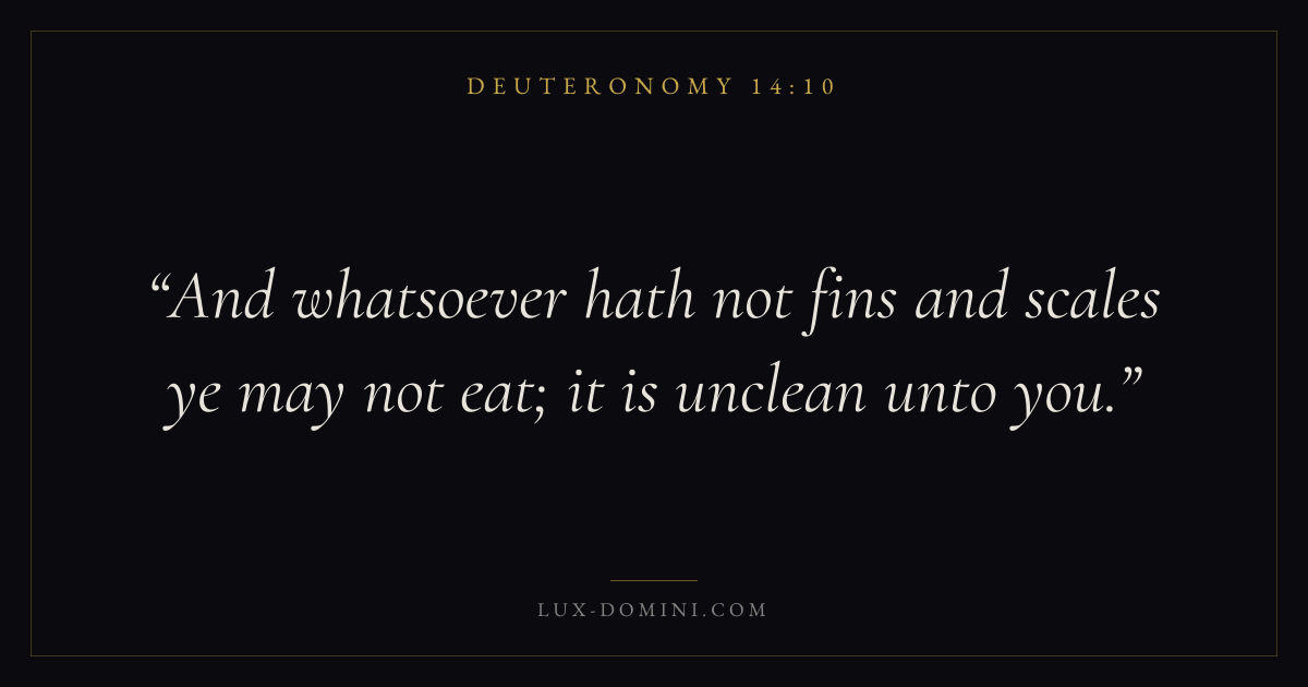 Books / Deuteronomy / Chapter 14 / Verse 10 ← Deuteronomy 14:9 Deuteronomy 14:10 Deuteronomy 14:11 → And whatsoever hath not fins and scales ye may not eat; it is unclean unto you. Download verse card Share on Twitter Share on Facebook Pin it ✦ Key themes LoveMemoryCovenantLove of God Read with Deuteronomy 14:9John 3:161 Corinthians 13:4 Related topics Bible verses about love ✦ Deuteronomy Chapter 14 verses V. 1 V. 2 V. 3 V. 4 V. 5 V. 6 V. 7 V. 8 V. 9 V. 10 V. 11 V. 12 V. 13 V. 14 V. 15 V. 16 V. 17 V. 18 V. 19 V. 20 V. 21 V. 22 V. 23 V. 24 V. 25 V. 26 V. 27 V. 28 V. 29