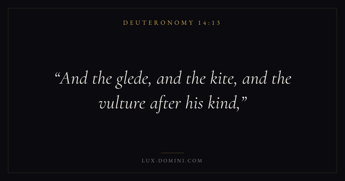 Books / Deuteronomy / Chapter 14 / Verse 13 ← Deuteronomy 14:12 Deuteronomy 14:13 Deuteronomy 14:14 → And the glede, and the kite, and the vulture after his kind, Download verse card Share on Twitter Share on Facebook Pin it ✦ Key themes LoveMemoryCovenantLove of God Read with Deuteronomy 14:11Deuteronomy 14:12John 3:161 Corinthians 13:4 Related topics Bible verses about love ✦ Deuteronomy Chapter 14 verses V. 1 V. 2 V. 3 V. 4 V. 5 V. 6 V. 7 V. 8 V. 9 V. 10 V. 11 V. 12 V. 13 V. 14 V. 15 V. 16 V. 17 V. 18 V. 19 V. 20 V. 21 V. 22 V. 23 V. 24 V. 25 V. 26 V. 27 V. 28 V. 29