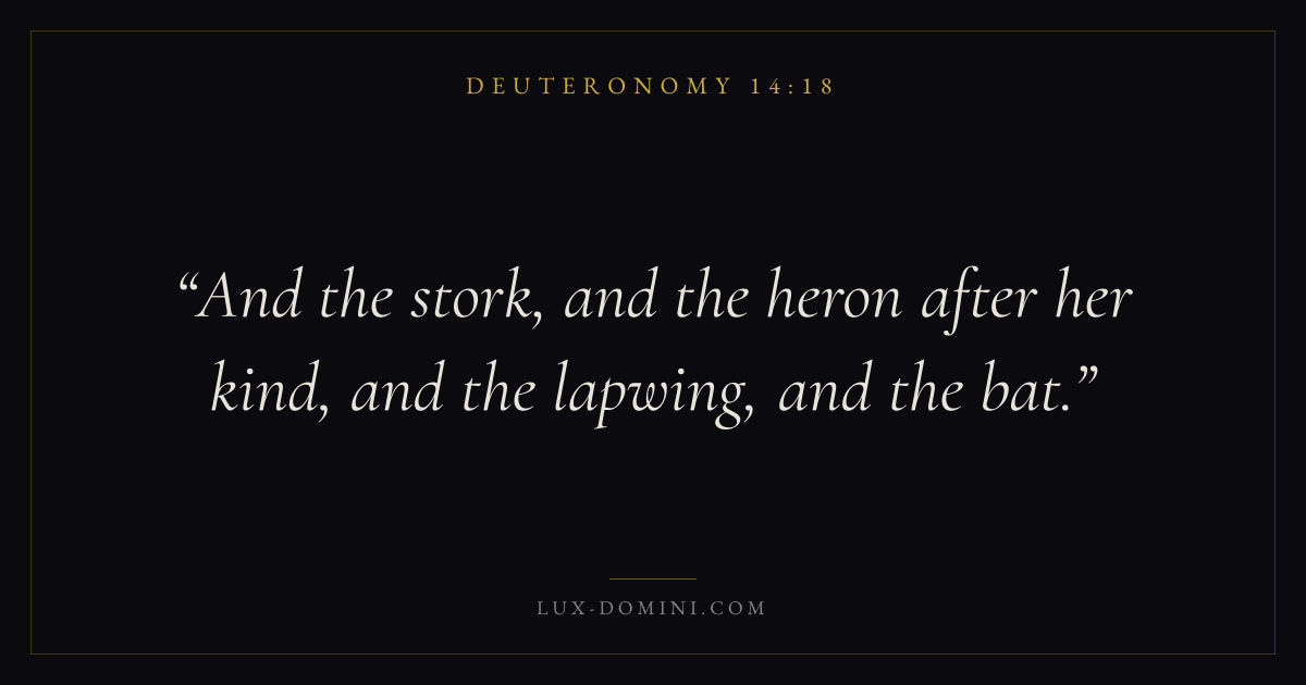 Books / Deuteronomy / Chapter 14 / Verse 18 ← Deuteronomy 14:17 Deuteronomy 14:18 Deuteronomy 14:19 → And the stork, and the heron after her kind, and the lapwing, and the bat. Download verse card Share on Twitter Share on Facebook Pin it ✦ Key themes LoveMemoryCovenantLove of God Read with Deuteronomy 14:16Deuteronomy 14:17John 3:161 Corinthians 13:4 Related topics Bible verses about love ✦ Deuteronomy Chapter 14 verses V. 1 V. 2 V. 3 V. 4 V. 5 V. 6 V. 7 V. 8 V. 9 V. 10 V. 11 V. 12 V. 13 V. 14 V. 15 V. 16 V. 17 V. 18 V. 19 V. 20 V. 21 V. 22 V. 23 V. 24 V. 25 V. 26 V. 27 V. 28 V. 29