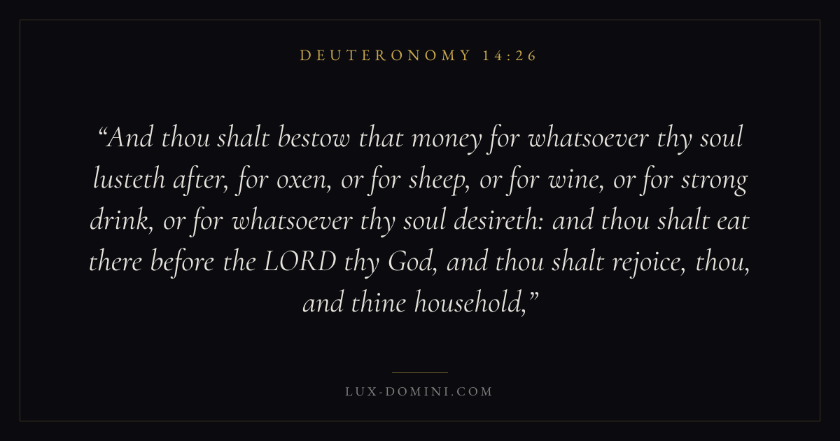 And thou shalt bestow that money for whatsoever thy soul lusteth after, for oxen, or for sheep, or for wine, or for strong drink, or for whatsoever thy soul desireth: and thou shalt eat there before the LORD thy God, and thou shalt rejoice, thou, and thine household,