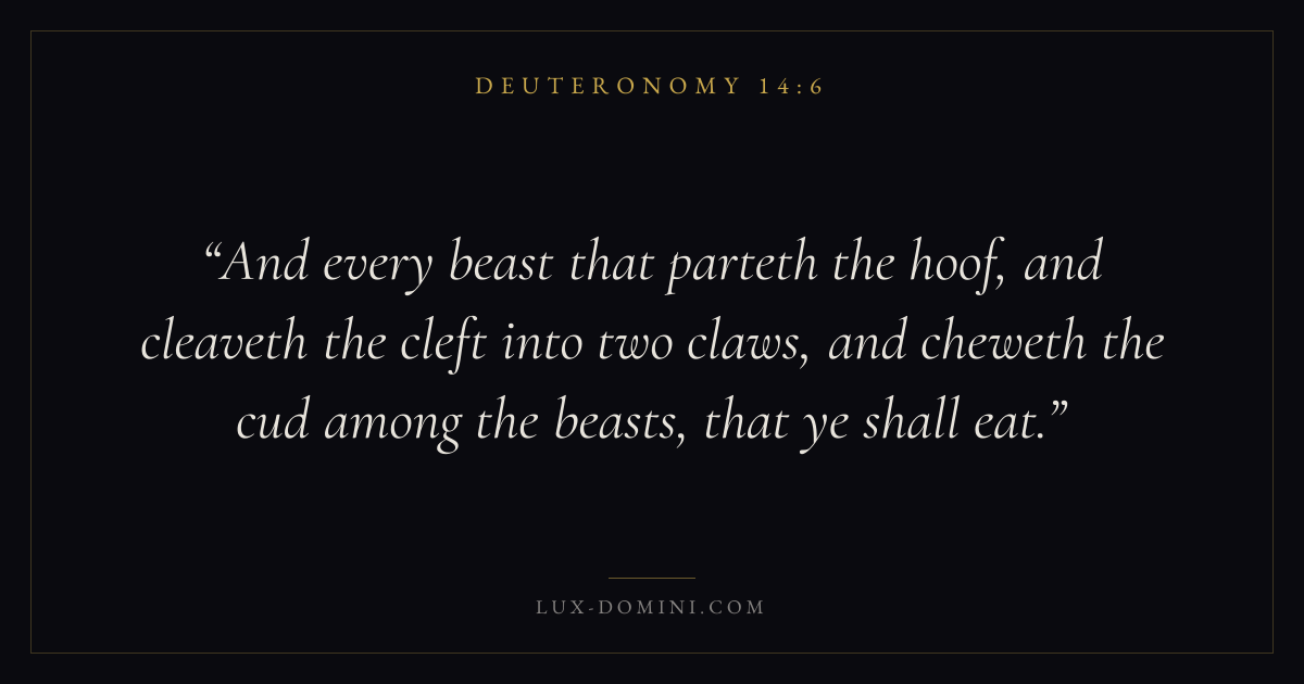 And every beast that parteth the hoof, and cleaveth the cleft into two claws, and cheweth the cud among the beasts, that ye shall eat.