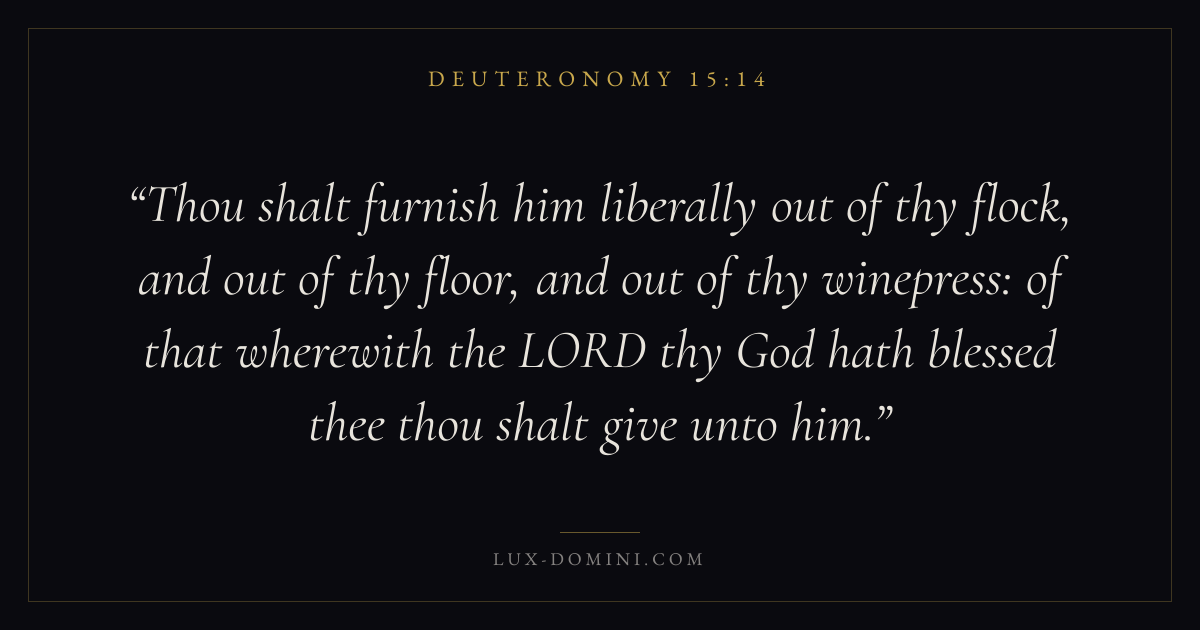 Thou shalt furnish him liberally out of thy flock, and out of thy floor, and out of thy winepress: of that wherewith the LORD thy God hath blessed thee thou shalt give unto him.