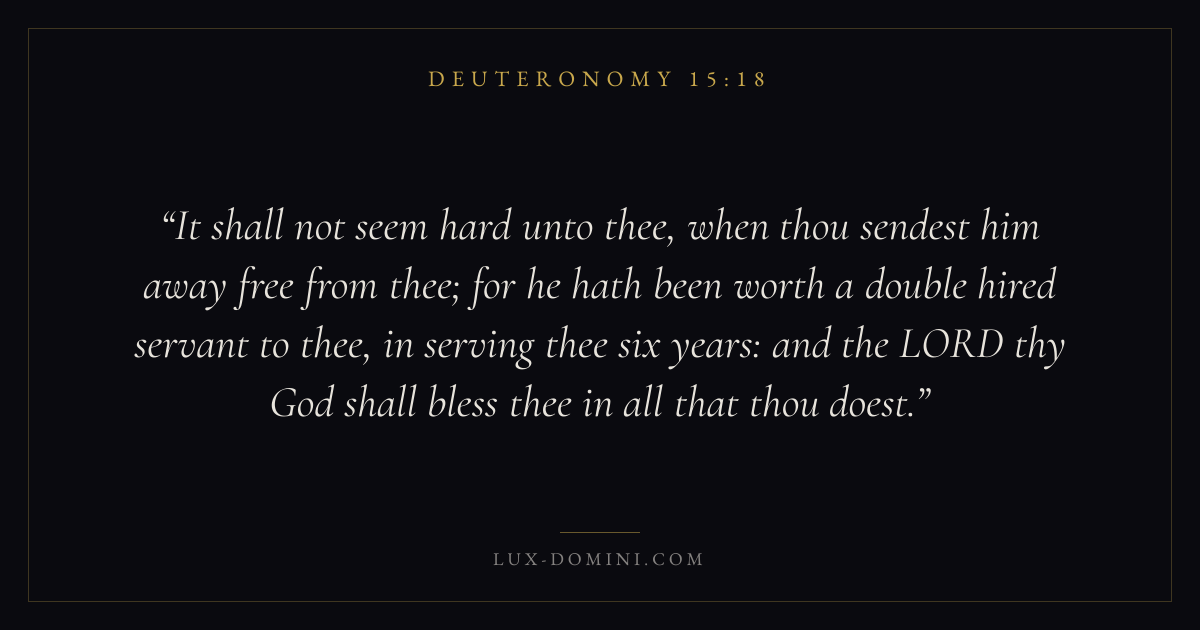 It shall not seem hard unto thee, when thou sendest him away free from thee; for he hath been worth a double hired servant to thee, in serving thee six years: and the LORD thy God shall bless thee in all that thou doest.