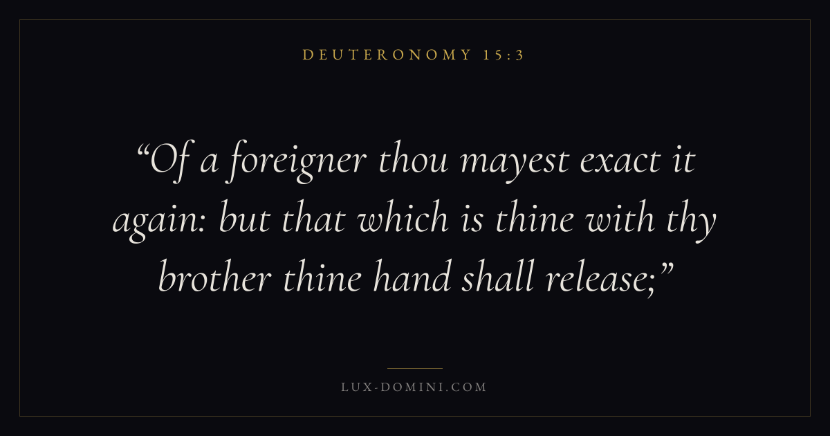 Of a foreigner thou mayest exact it again: but that which is thine with thy brother thine hand shall release;