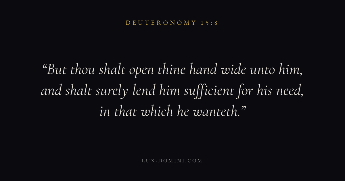 But thou shalt open thine hand wide unto him, and shalt surely lend him sufficient for his need, in that which he wanteth.