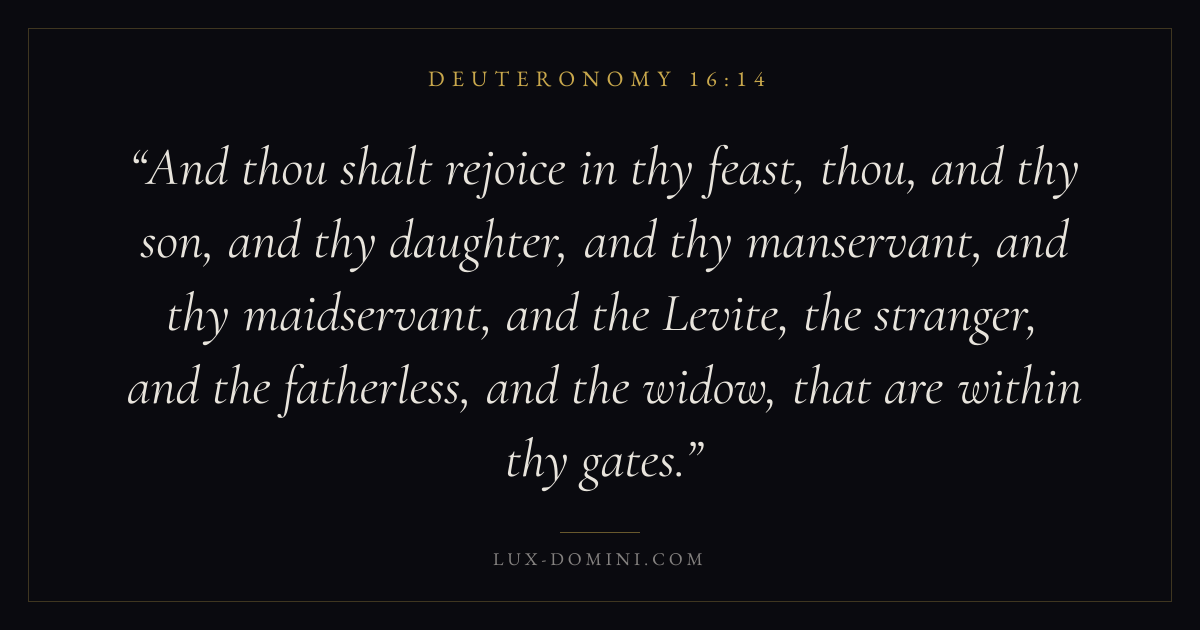 And thou shalt rejoice in thy feast, thou, and thy son, and thy daughter, and thy manservant, and thy maidservant, and the Levite, the stranger, and the fatherless, and the widow, that are within thy gates.