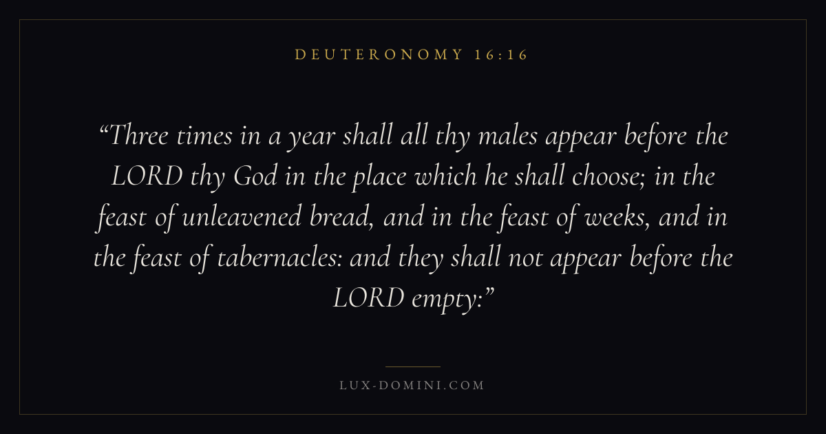 Three times in a year shall all thy males appear before the LORD thy God in the place which he shall choose; in the feast of unleavened bread, and in the feast of weeks, and in the feast of tabernacles: and they shall not appear before the LORD empty: