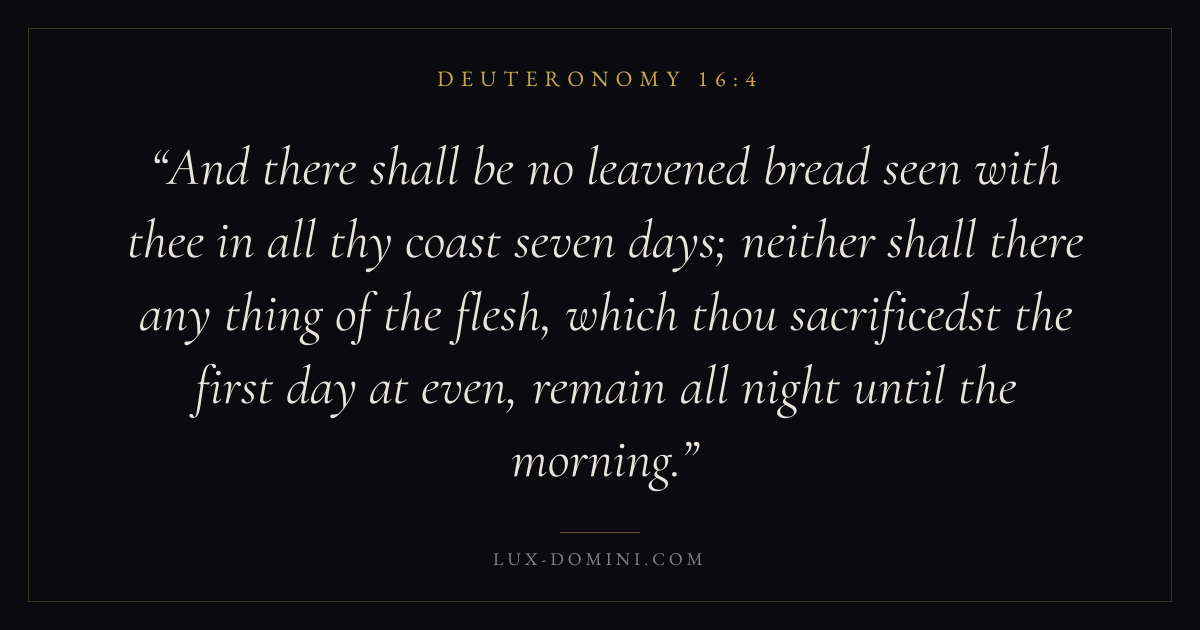 And there shall be no leavened bread seen with thee in all thy coast seven days; neither shall there any thing of the flesh, which thou sacrificedst the first day at even, remain all night until the morning.