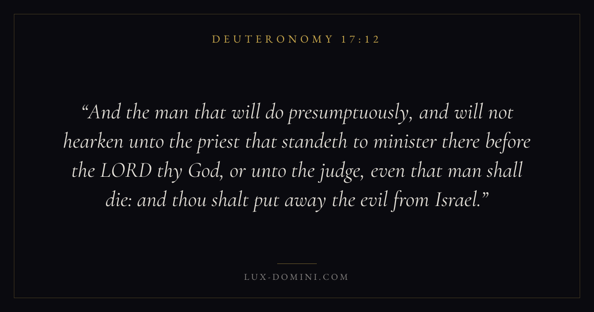 And the man that will do presumptuously, and will not hearken unto the priest that standeth to minister there before the LORD thy God, or unto the judge, even that man shall die: and thou shalt put away the evil from Israel.