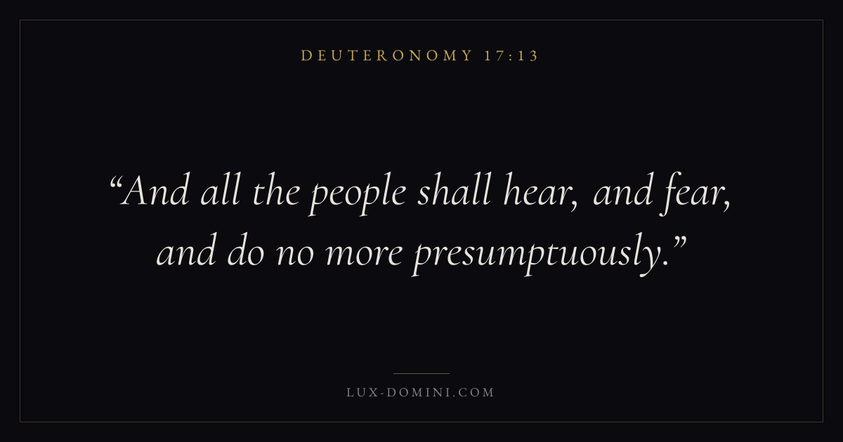Books / Deuteronomy / Chapter 17 / Verse 13 ← Deuteronomy 17:12 Deuteronomy 17:13 Deuteronomy 17:14 → And all the people shall hear, and fear, and do no more presumptuously. Download verse card Share on Twitter Share on Facebook Pin it ✦ Key themes LoveHopeAnxiety and fearWisdomMemory Read with John 3:161 Corinthians 13:4Romans 8:24Revelation 21:4 Related topics Bible verses about loveBible verses about hopeBible verses about anxiety and fearBible verses about wisdom ✦ Deuteronomy Chapter 17 verses V. 1 V. 2 V. 3 V. 4 V. 5 V. 6 V. 7 V. 8 V. 9 V. 10 V. 11 V. 12 V. 13 V. 14 V. 15 V. 16 V. 17 V. 18 V. 19 V. 20