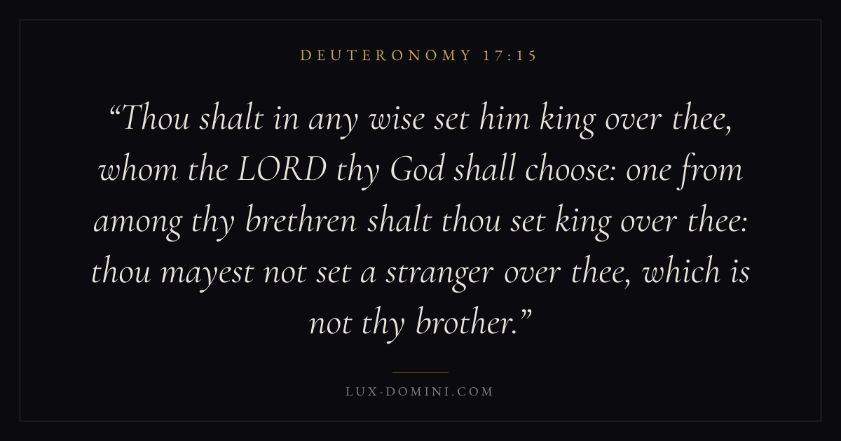 Thou shalt in any wise set him king over thee, whom the LORD thy God shall choose: one from among thy brethren shalt thou set king over thee: thou mayest not set a stranger over thee, which is not thy brother.