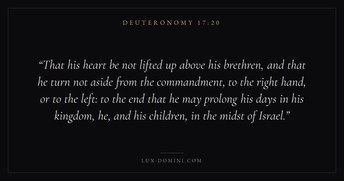 That his heart be not lifted up above his brethren, and that he turn not aside from the commandment, to the right hand, or to the left: to the end that he may prolong his days in his kingdom, he, and his children, in the midst of Israel.