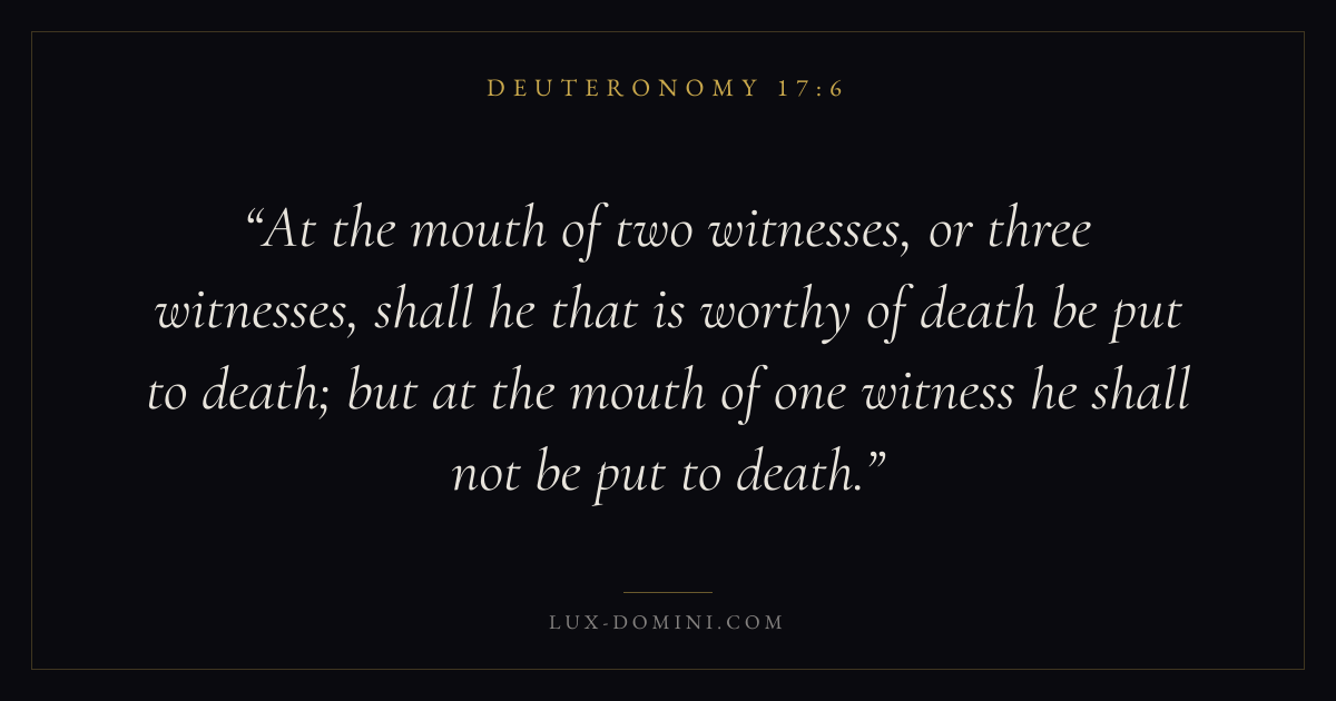 At the mouth of two witnesses, or three witnesses, shall he that is worthy of death be put to death; but at the mouth of one witness he shall not be put to death.
