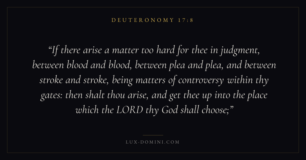 If there arise a matter too hard for thee in judgment, between blood and blood, between plea and plea, and between stroke and stroke, being matters of controversy within thy gates: then shalt thou arise, and get thee up into the place which the LORD thy God shall choose;
