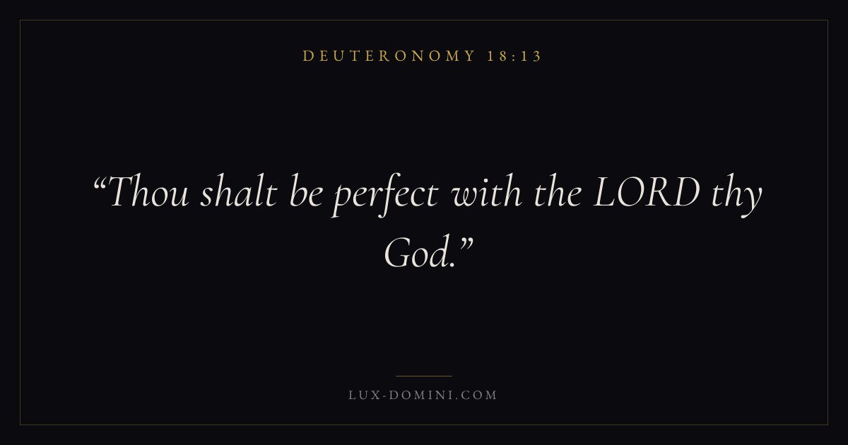 Books / Deuteronomy / Chapter 18 / Verse 13 ← Deuteronomy 18:12 Deuteronomy 18:13 Deuteronomy 18:14 → Thou shalt be perfect with the LORD thy God. Download verse card Share on Twitter Share on Facebook Pin it ✦ Key themes LoveMemoryCovenantLove of God Read with Deuteronomy 18:14John 3:161 Corinthians 13:4 Related topics Bible verses about love ✦ Deuteronomy Chapter 18 verses V. 1 V. 2 V. 3 V. 4 V. 5 V. 6 V. 7 V. 8 V. 9 V. 10 V. 11 V. 12 V. 13 V. 14 V. 15 V. 16 V. 17 V. 18 V. 19 V. 20 V. 21 V. 22