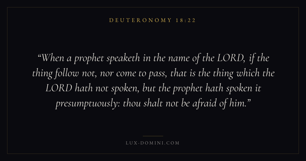 When a prophet speaketh in the name of the LORD, if the thing follow not, nor come to pass, that is the thing which the LORD hath not spoken, but the prophet hath spoken it presumptuously: thou shalt not be afraid of him.