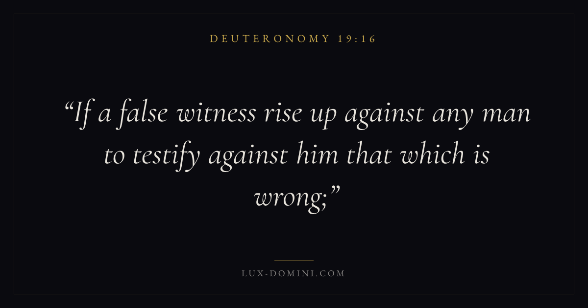 Books / Deuteronomy / Chapter 19 / Verse 16 ← Deuteronomy 19:15 Deuteronomy 19:16 Deuteronomy 19:17 → If a false witness rise up against any man to testify against him that which is wrong; Download verse card Share on Twitter Share on Facebook Pin it ✦ Key themes LoveSuffering and trialsTruthMemory Read with Deuteronomy 19:17Deuteronomy 19:18John 3:161 Corinthians 13:4 Related topics Bible verses about loveBible verses about suffering and trialsBible verses about truth ✦ Deuteronomy Chapter 19 verses V. 1 V. 2 V. 3 V. 4 V. 5 V. 6 V. 7 V. 8 V. 9 V. 10 V. 11 V. 12 V. 13 V. 14 V. 15 V. 16 V. 17 V. 18 V. 19 V. 20 V. 21