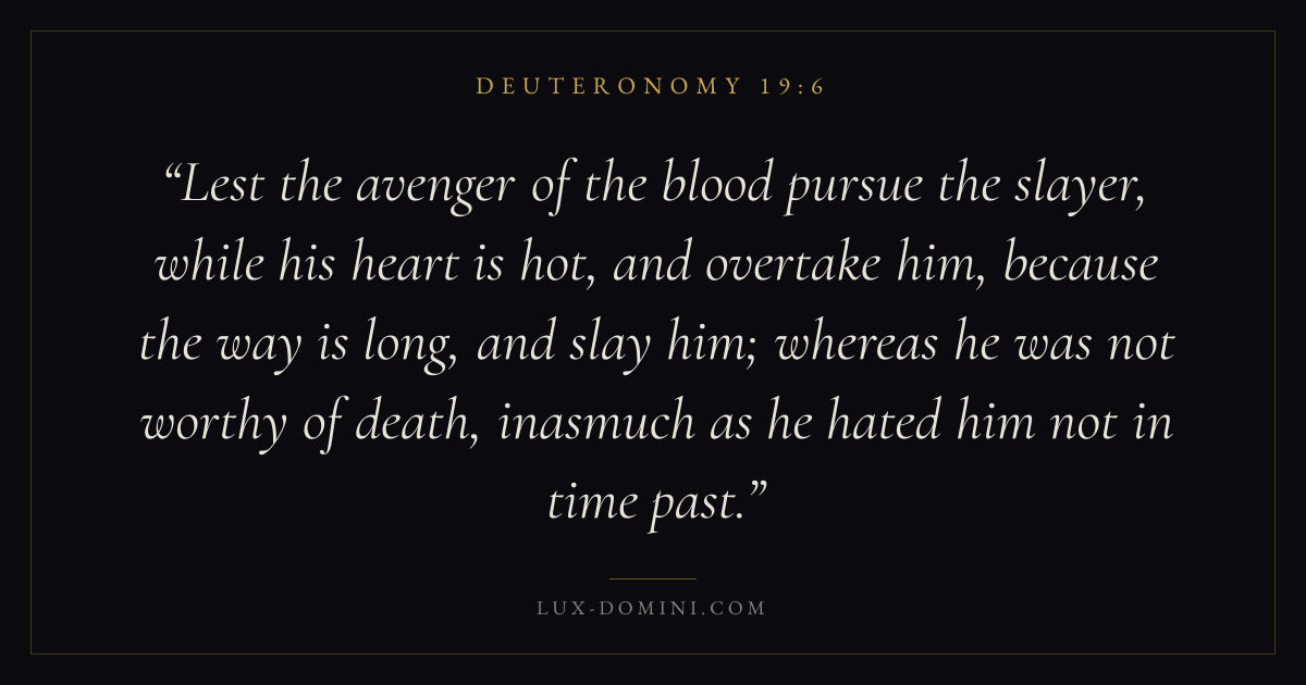 Lest the avenger of the blood pursue the slayer, while his heart is hot, and overtake him, because the way is long, and slay him; whereas he was not worthy of death, inasmuch as he hated him not in time past.