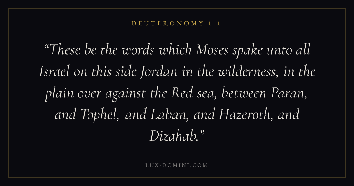 These be the words which Moses spake unto all Israel on this side Jordan in the wilderness, in the plain over against the Red sea, between Paran, and Tophel, and Laban, and Hazeroth, and Dizahab.