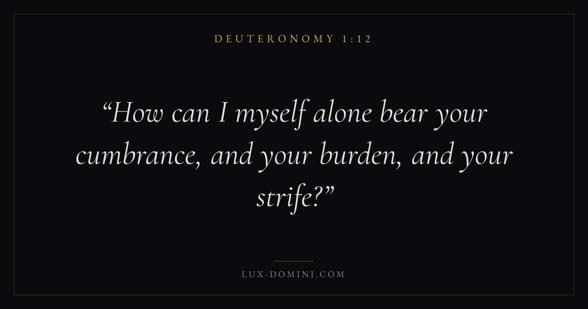 Books / Deuteronomy / Chapter 1 / Verse 12 ← Deuteronomy 1:11 Deuteronomy 1:12 Deuteronomy 1:13 → How can I myself alone bear your cumbrance, and your burden, and your strife? Download verse card Share on Twitter Share on Facebook Pin it ✦ Key themes LoveHopeMemoryCovenant Read with Deuteronomy 1:11John 3:161 Corinthians 13:4Romans 8:24 Related topics Bible verses about loveBible verses about hope ✦ Deuteronomy Chapter 1 verses V. 1 V. 2 V. 3 V. 4 V. 5 V. 6 V. 7 V. 8 V. 9 V. 10 V. 11 V. 12 V. 13 V. 14 V. 15 V. 16 V. 17 V. 18 V. 19 V. 20 V. 21 V. 22 V. 23 V. 24 V. 25 V. 26 V. 27 V. 28 V. 29 V. 30 V. 31 V. 32 V. 33 V. 34 V. 35 V. 36 V. 37 V. 38 V. 39 V. 40 V. 41 V. 42 V. 43 V. 44 V. 45 V. 46