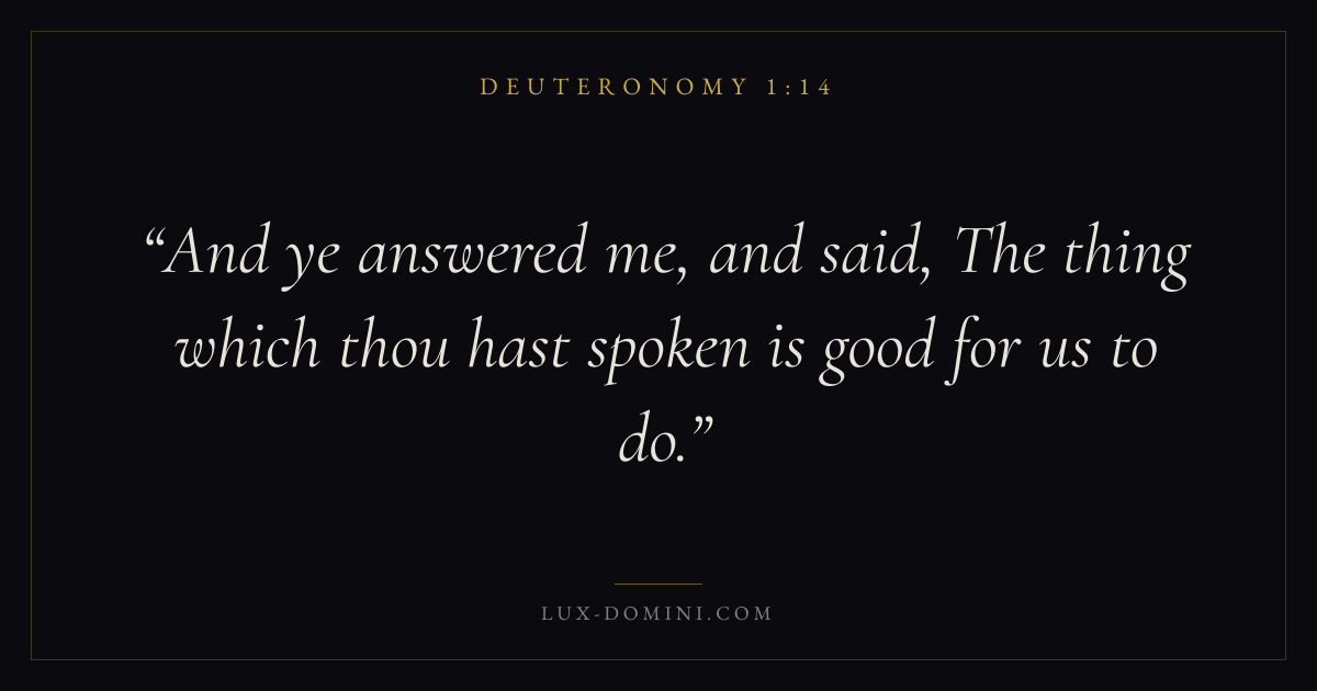 Books / Deuteronomy / Chapter 1 / Verse 14 ← Deuteronomy 1:13 Deuteronomy 1:14 Deuteronomy 1:15 → And ye answered me, and said, The thing which thou hast spoken is good for us to do. Download verse card Share on Twitter Share on Facebook Pin it ✦ Key themes LoveHopeMemoryCovenant Read with Deuteronomy 1:13Deuteronomy 1:15John 3:161 Corinthians 13:4 Related topics Bible verses about loveBible verses about hope ✦ Deuteronomy Chapter 1 verses V. 1 V. 2 V. 3 V. 4 V. 5 V. 6 V. 7 V. 8 V. 9 V. 10 V. 11 V. 12 V. 13 V. 14 V. 15 V. 16 V. 17 V. 18 V. 19 V. 20 V. 21 V. 22 V. 23 V. 24 V. 25 V. 26 V. 27 V. 28 V. 29 V. 30 V. 31 V. 32 V. 33 V. 34 V. 35 V. 36 V. 37 V. 38 V. 39 V. 40 V. 41 V. 42 V. 43 V. 44 V. 45 V. 46