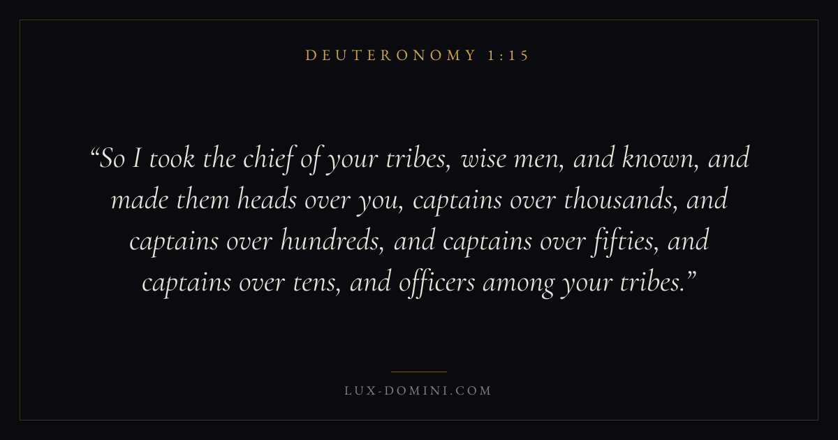 So I took the chief of your tribes, wise men, and known, and made them heads over you, captains over thousands, and captains over hundreds, and captains over fifties, and captains over tens, and officers among your tribes.