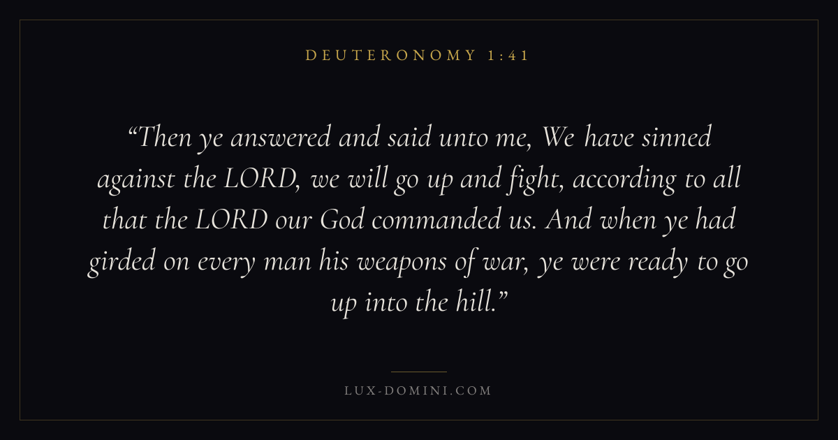 Then ye answered and said unto me, We have sinned against the LORD, we will go up and fight, according to all that the LORD our God commanded us. And when ye had girded on every man his weapons of war, ye were ready to go up into the hill.