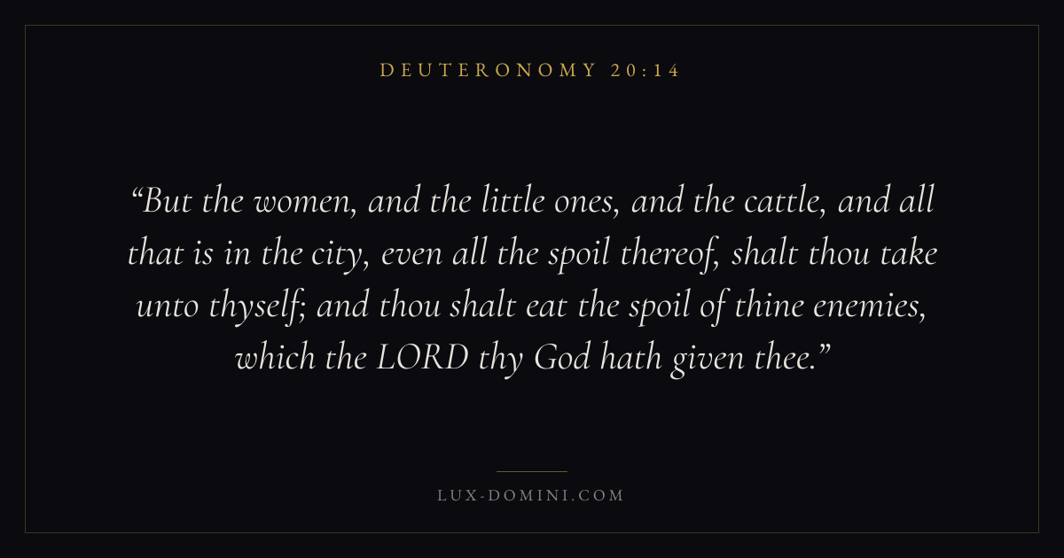 But the women, and the little ones, and the cattle, and all that is in the city, even all the spoil thereof, shalt thou take unto thyself; and thou shalt eat the spoil of thine enemies, which the LORD thy God hath given thee.