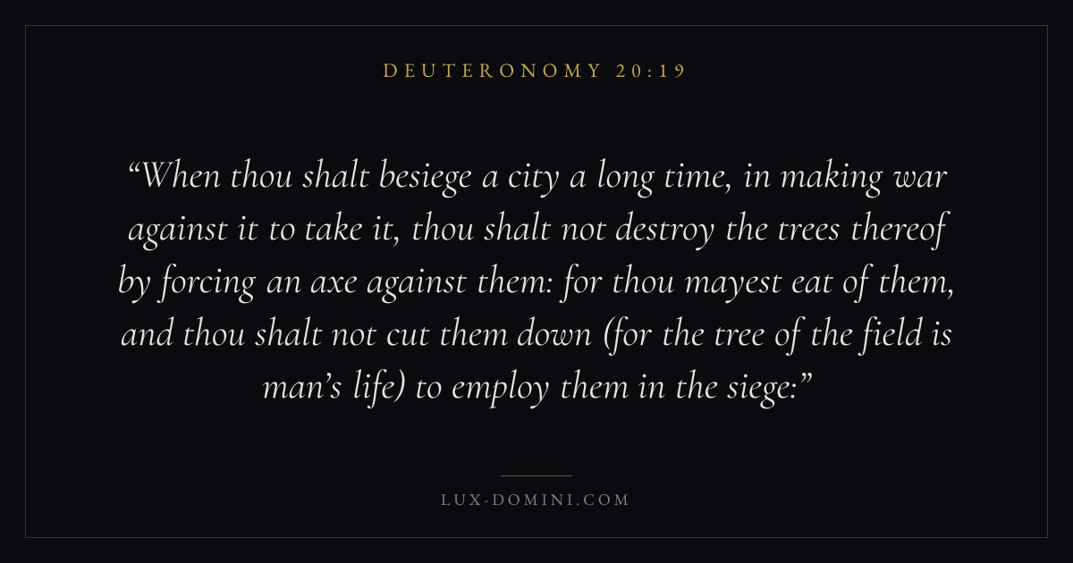 When thou shalt besiege a city a long time, in making war against it to take it, thou shalt not destroy the trees thereof by forcing an axe against them: for thou mayest eat of them, and thou shalt not cut them down (for the tree of the field is man’s life) to employ them in the siege:
