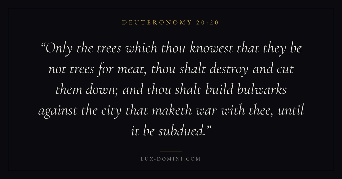 Only the trees which thou knowest that they be not trees for meat, thou shalt destroy and cut them down; and thou shalt build bulwarks against the city that maketh war with thee, until it be subdued.