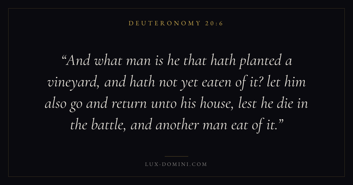 And what man is he that hath planted a vineyard, and hath not yet eaten of it? let him also go and return unto his house, lest he die in the battle, and another man eat of it.