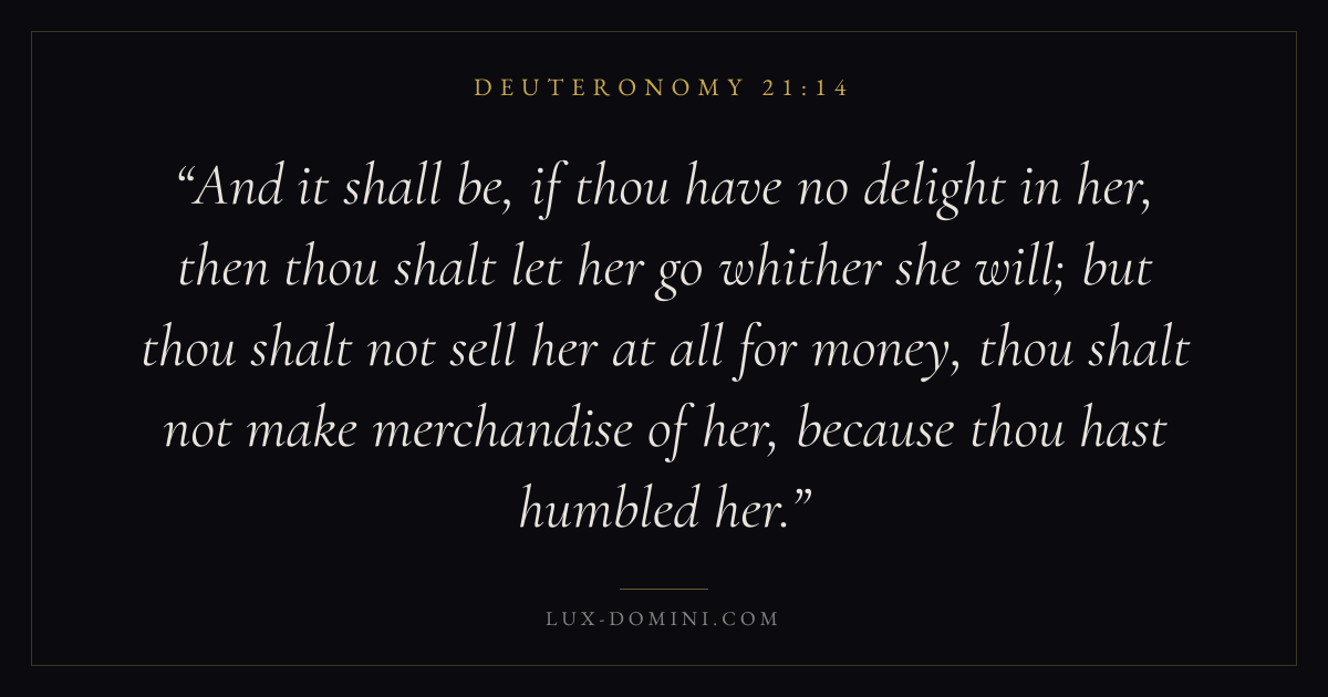 And it shall be, if thou have no delight in her, then thou shalt let her go whither she will; but thou shalt not sell her at all for money, thou shalt not make merchandise of her, because thou hast humbled her.