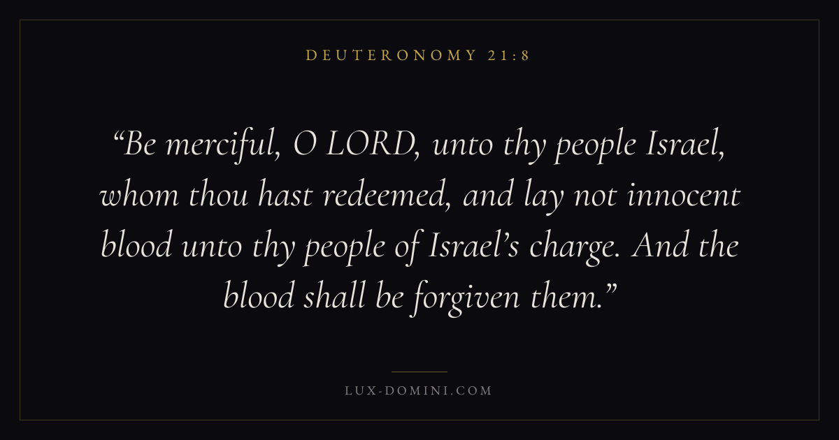 Be merciful, O LORD, unto thy people Israel, whom thou hast redeemed, and lay not innocent blood unto thy people of Israel’s charge. And the blood shall be forgiven them.